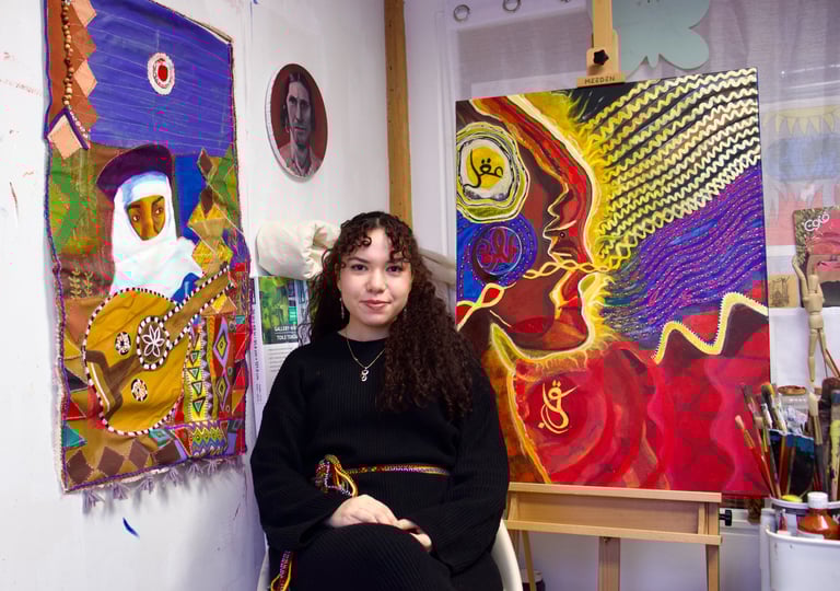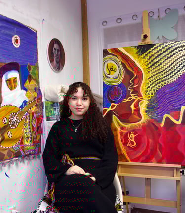 Amina Boufennara is a Toronto-based artist and OCADU alumna whose work blends Amazigh culture, immigration, folklore, and spirituality. Drawing on her Algerian roots and Canadian upbringing, she weaves personal and ancestral stories into tapestries and paintings that explore identity, memory, and heritage. Using paint, canvas, threads, embroidery, fabrics, and mixed-media layers, Amina creates rich, textured works that invite reflection and emotional engagement. Her practice celebrates Amazigh culture, evokes spiritual depth, and seeks to connect communities by highlighting shared cultural traditions and fostering spaces for collective storytelling.